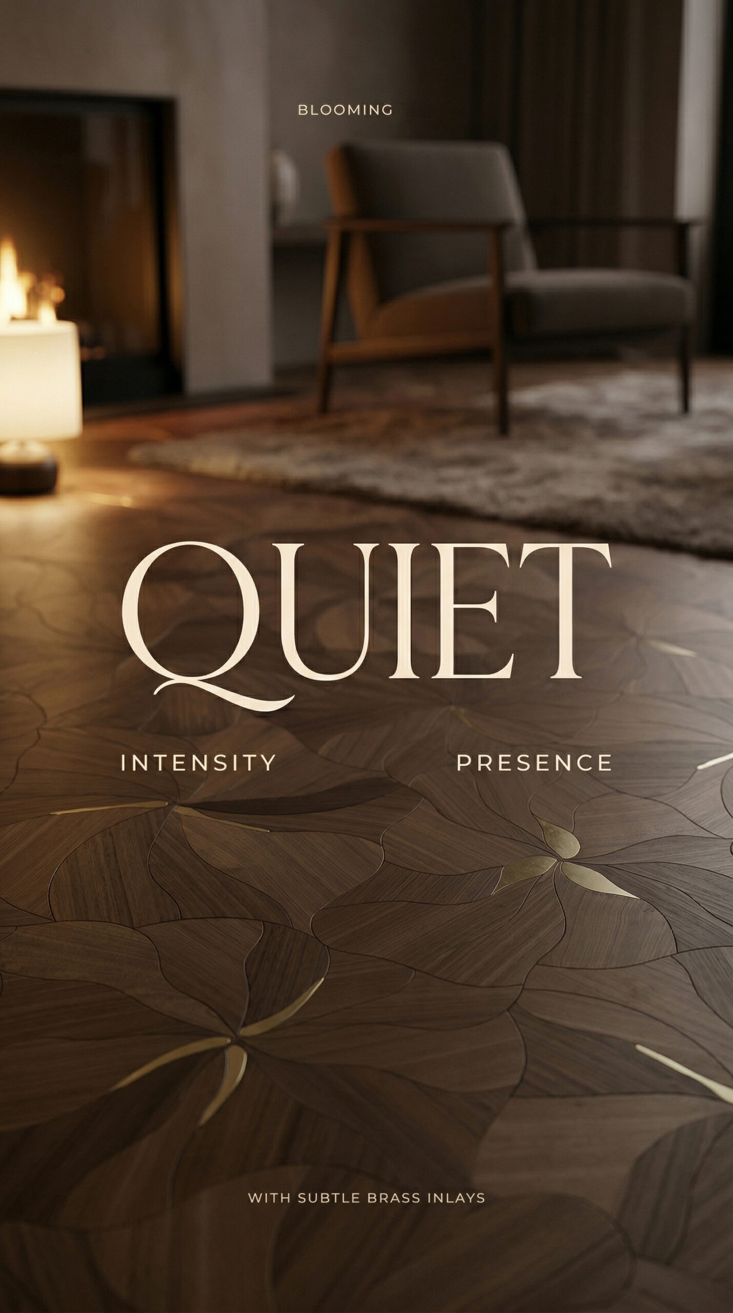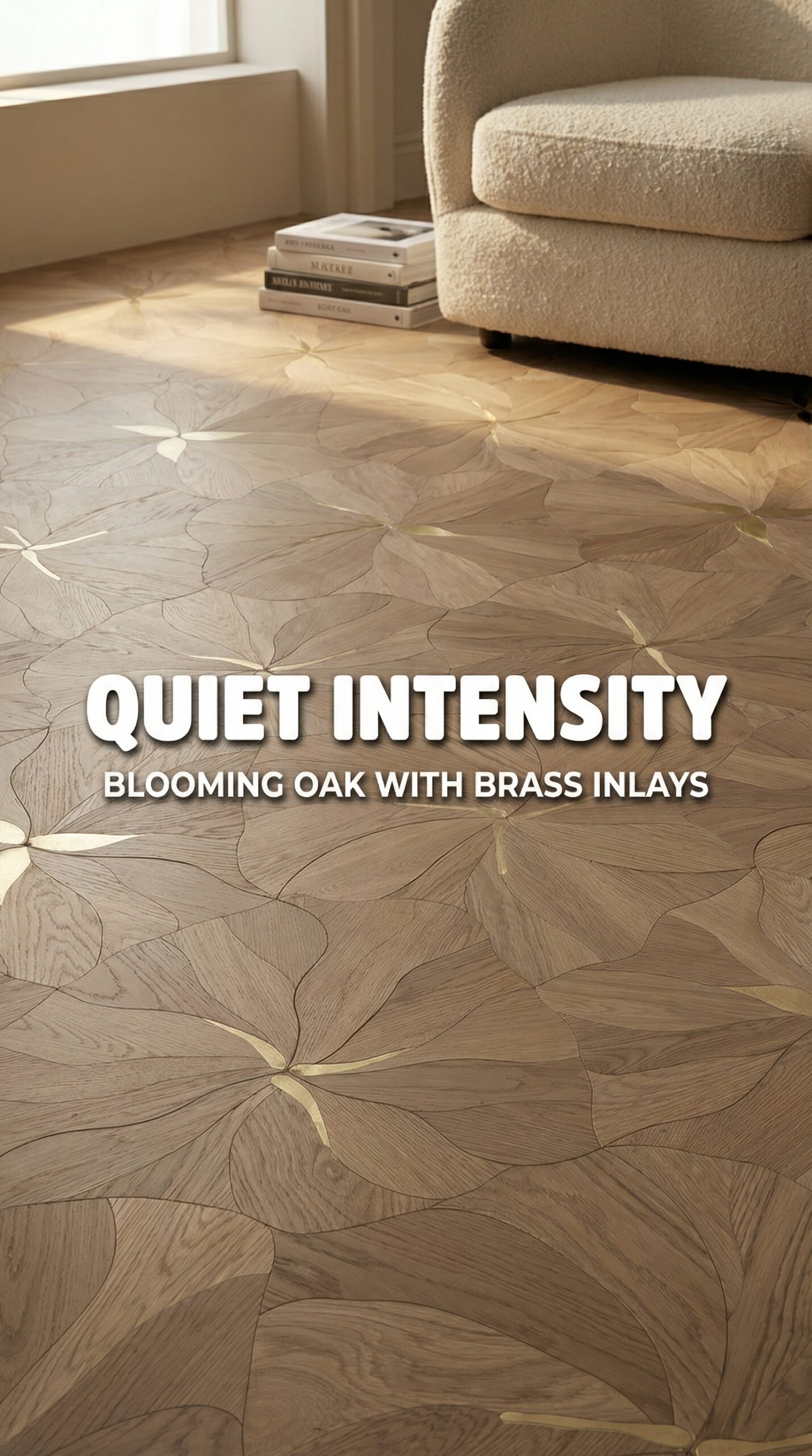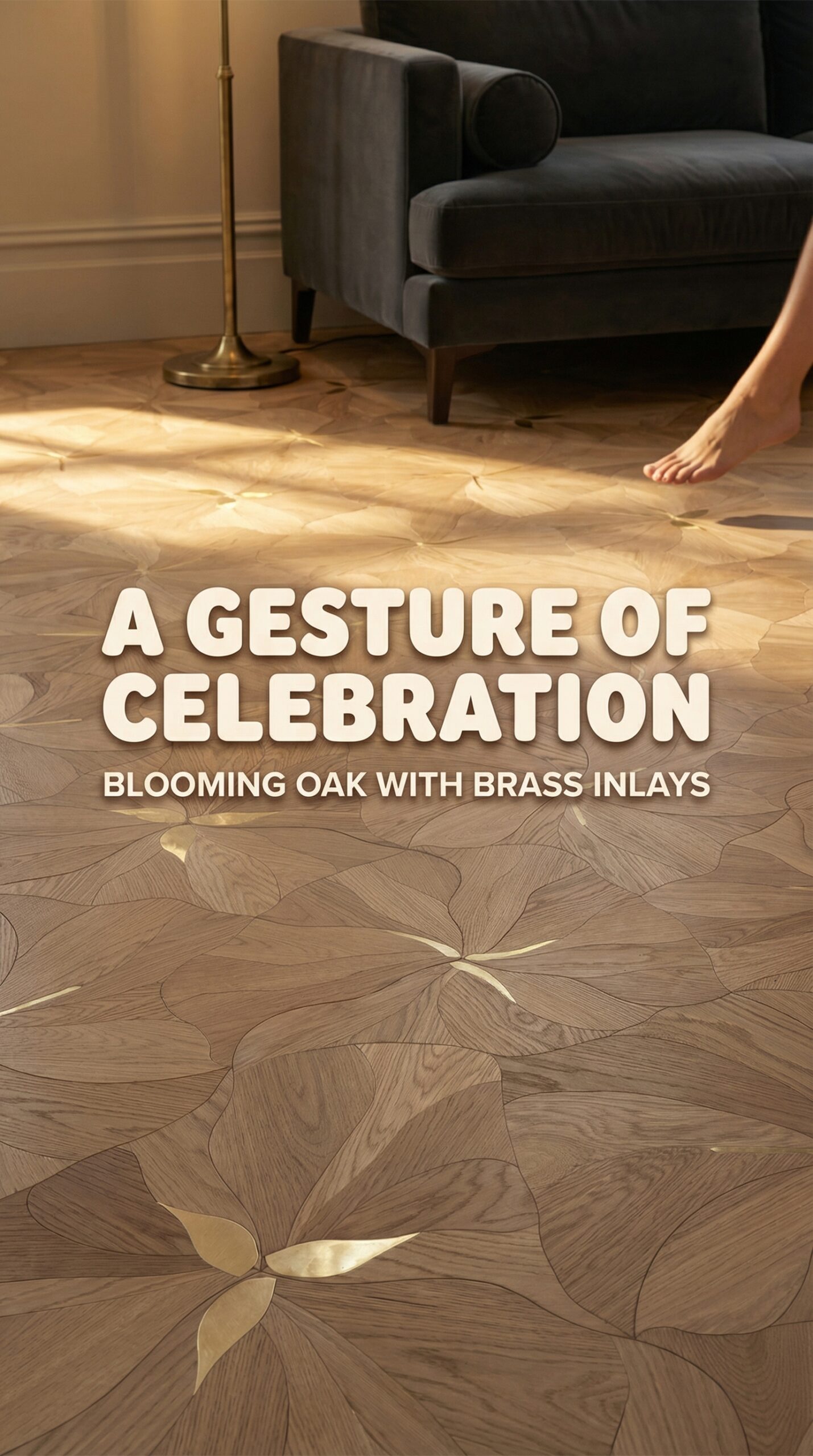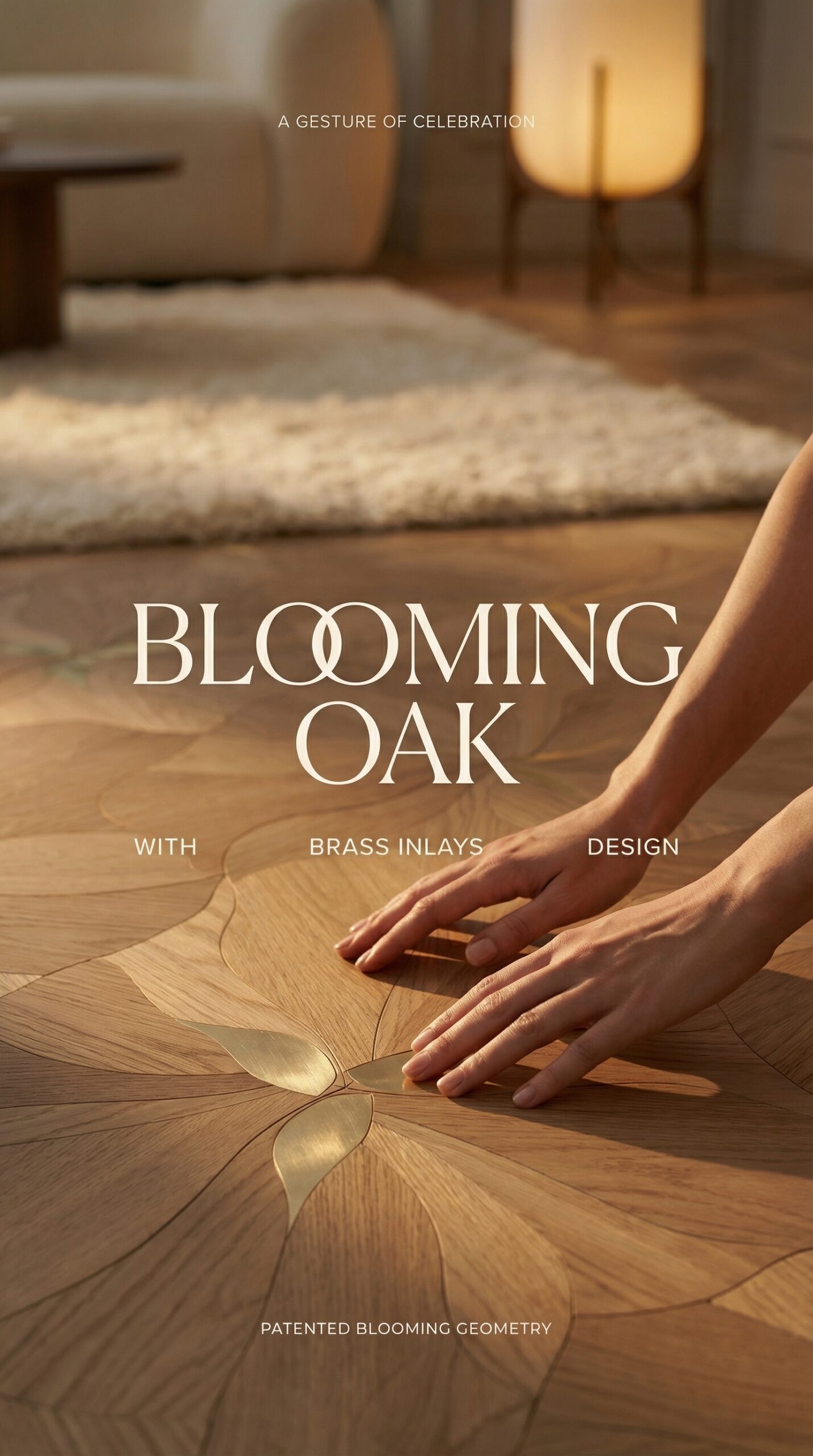There are moments when a space asks for more. More warmth, more depth, more presence. Blooming Oak, in its darker nuance, brings that quiet intensity that transforms a room from ordinary to memorable. The Bouquet design reveals itself slowly, shaped through the patented Blooming geometry and elevated with subtle brass inlays that capture light like a gesture of celebration.