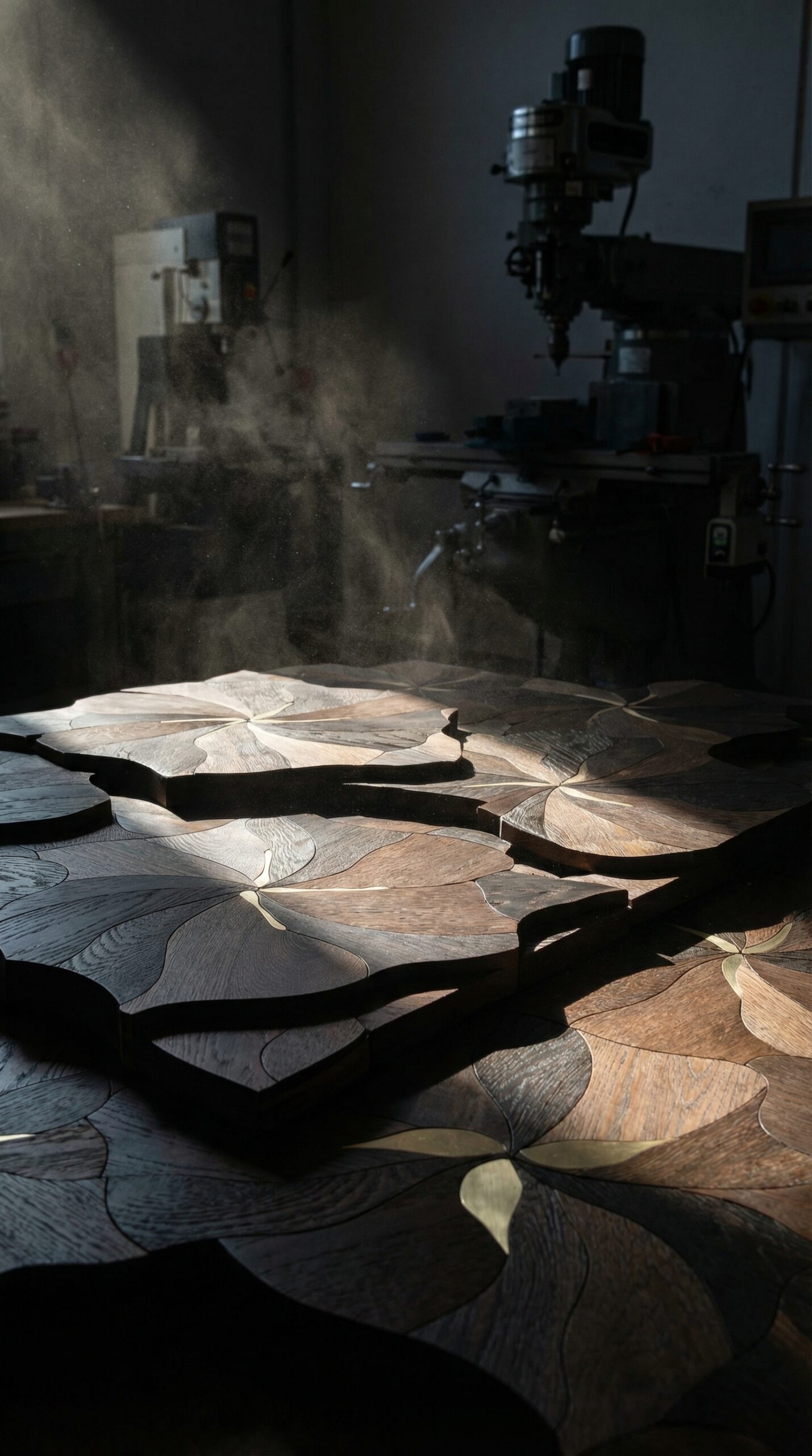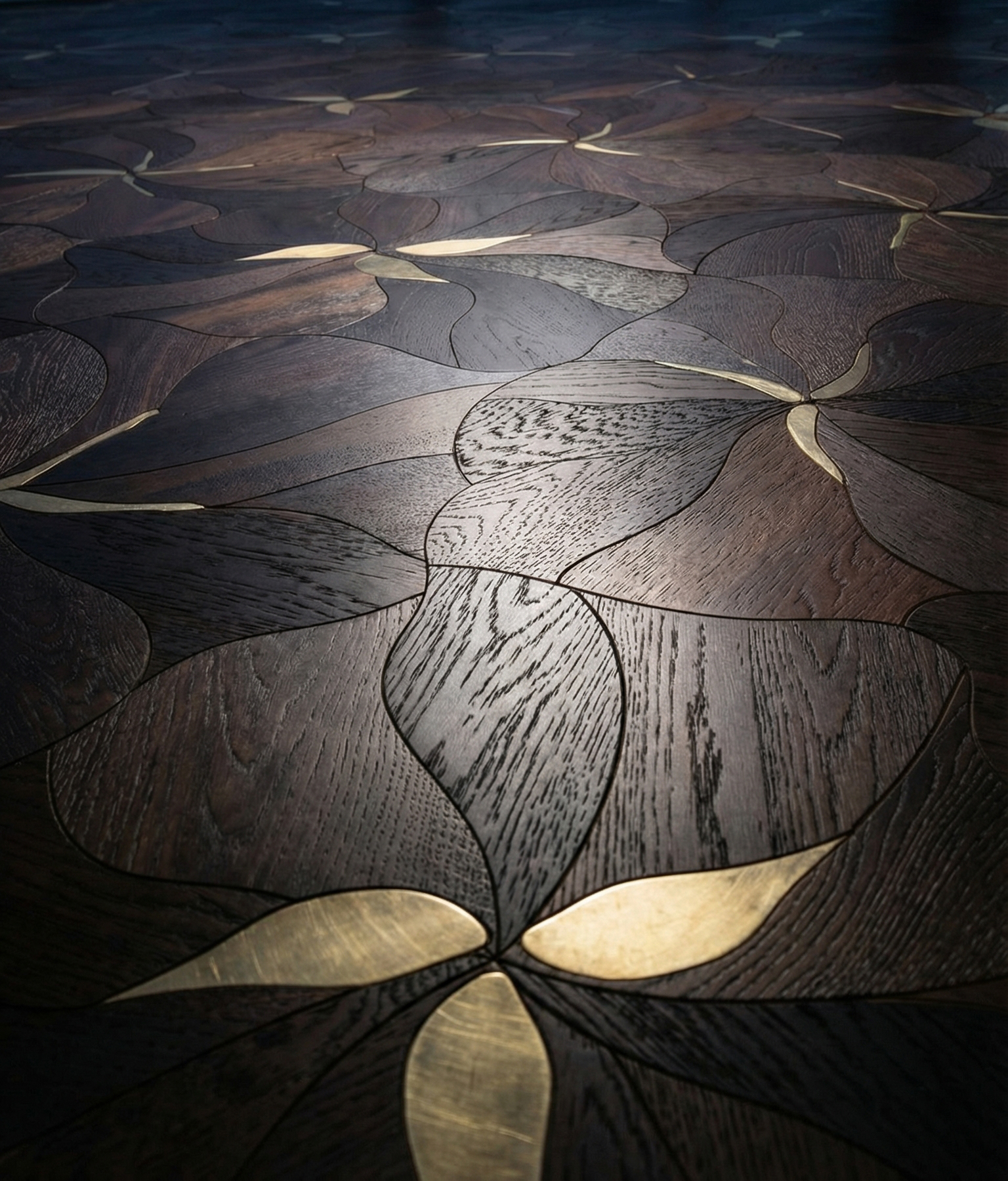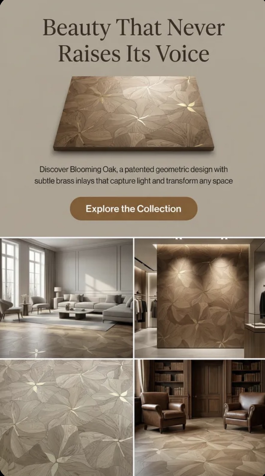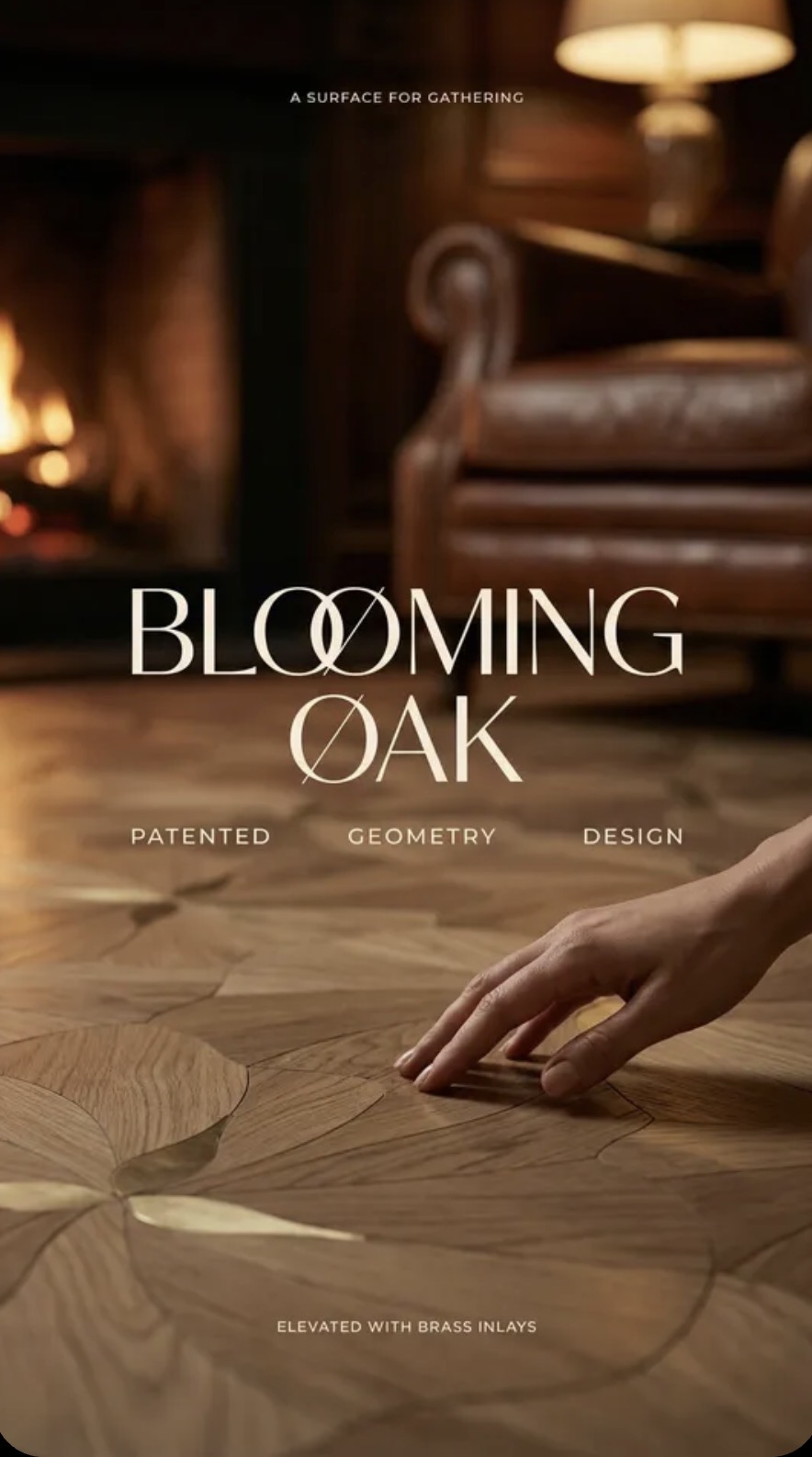 There are moments when a space asks for more. More warmth, more depth, more presence. Blooming Oak, in its darker nuance, brings that quiet intensity that transforms a room from ordinary to memorable. The Bouquet design reveals itself slowly, shaped through the patented Blooming geometry and elevated with subtle brass inlays that capture light like a gesture of celebration.